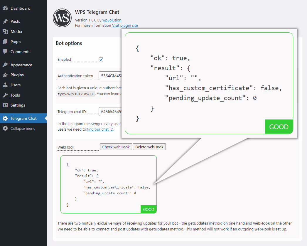 Click Check webHook button. If the settings are correct, you will see the info box with a green frame labeled GOOD.