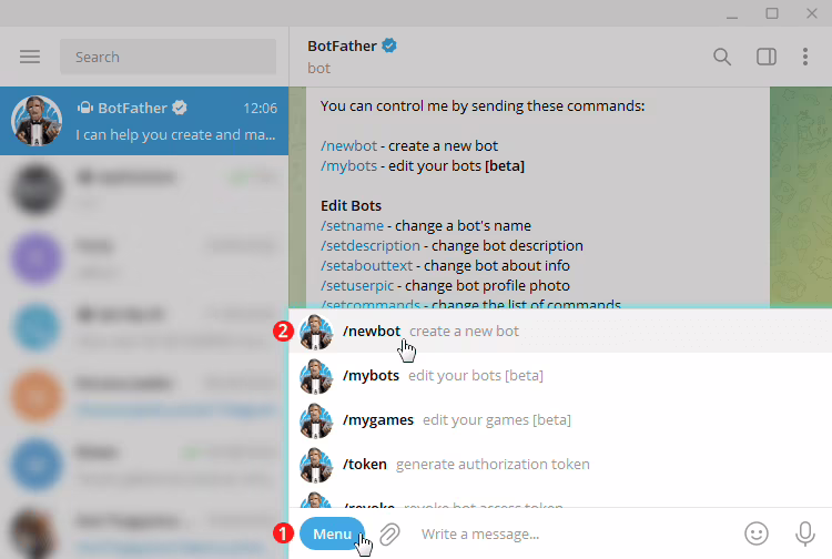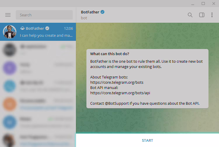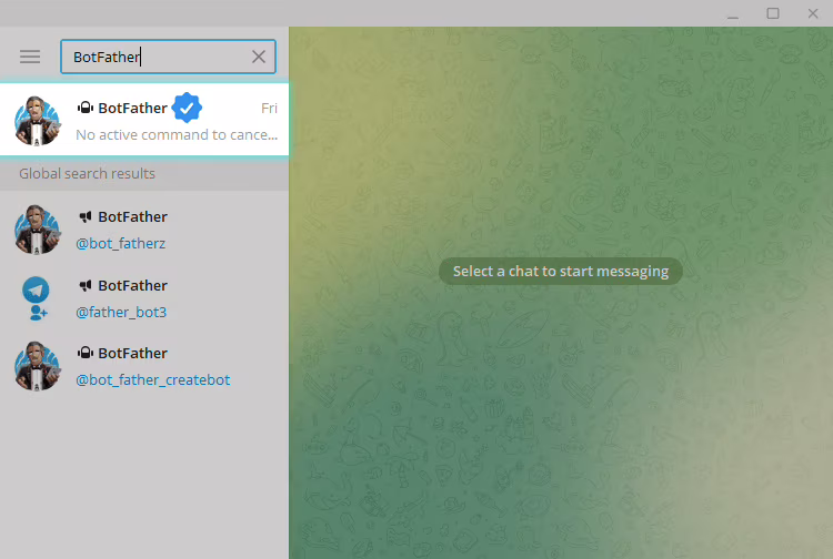 Inside your Telegram App, you need to search BotFather username and start a conversation with him. ★ Official Telegram bots have a blue checkmark beside their name.