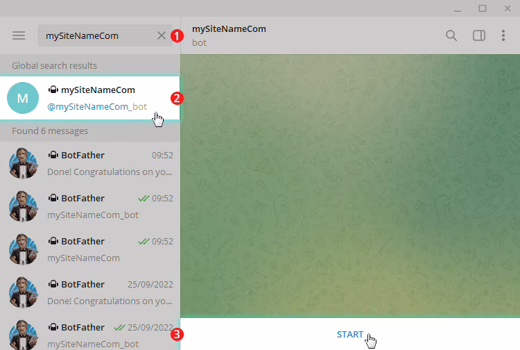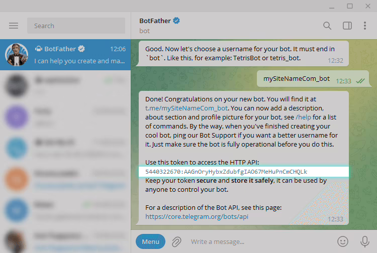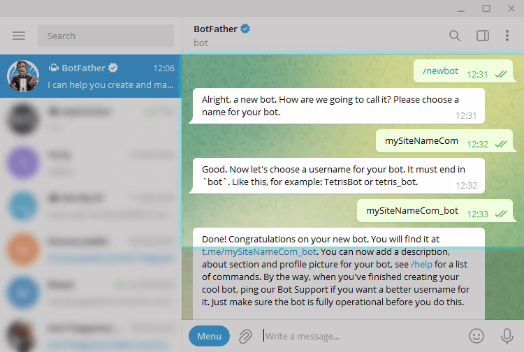 The username has to be unique, and memorable like your website address, for example “mySiteNameCom”. After you choose a suitable name the bot will be created.