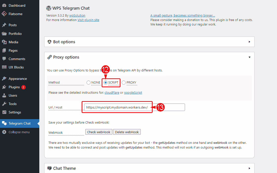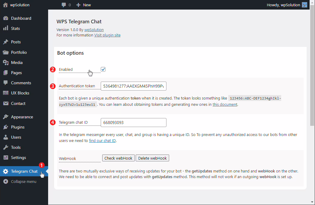 Go to your WordPress admin dashboard, then find the Plugins menu. Click on Add New and search for “wpSolution Telegram Chat“. Install and Activate the plugin through the Plugins menu in WordPress.