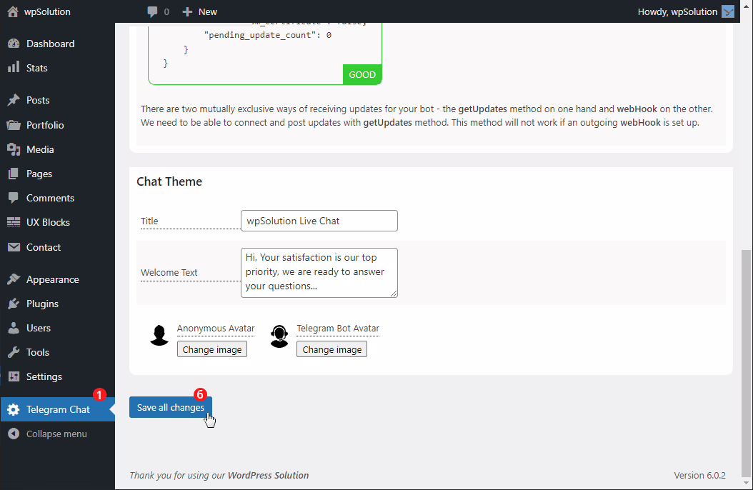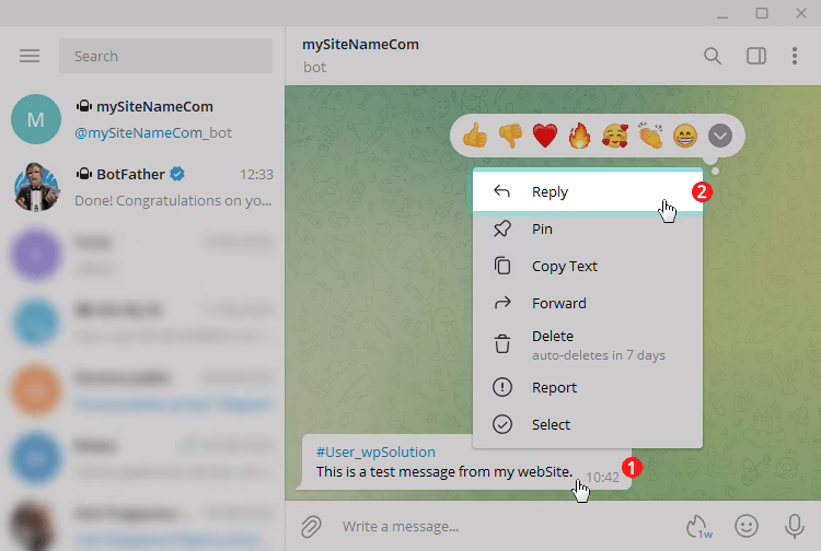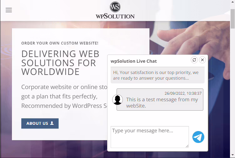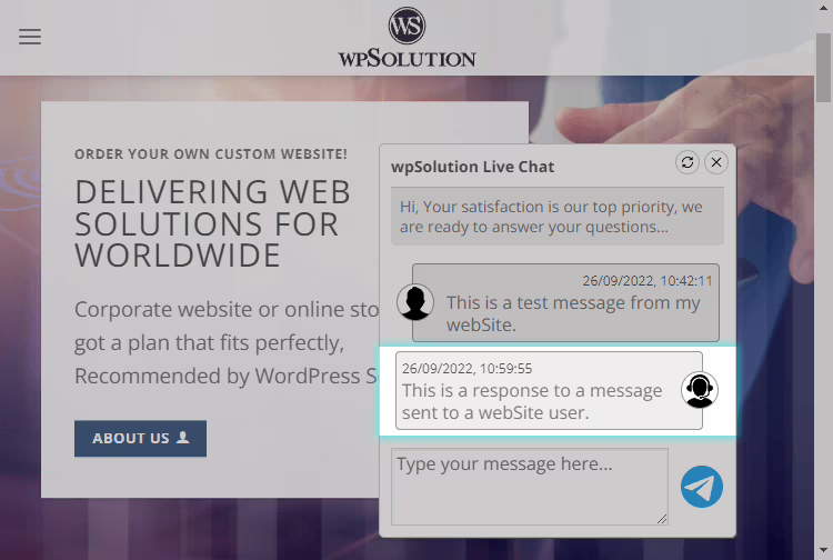Go to your webSite with connected and configured WPS Telegram Chat plugin, Step#4. Send a test message from your webSite.