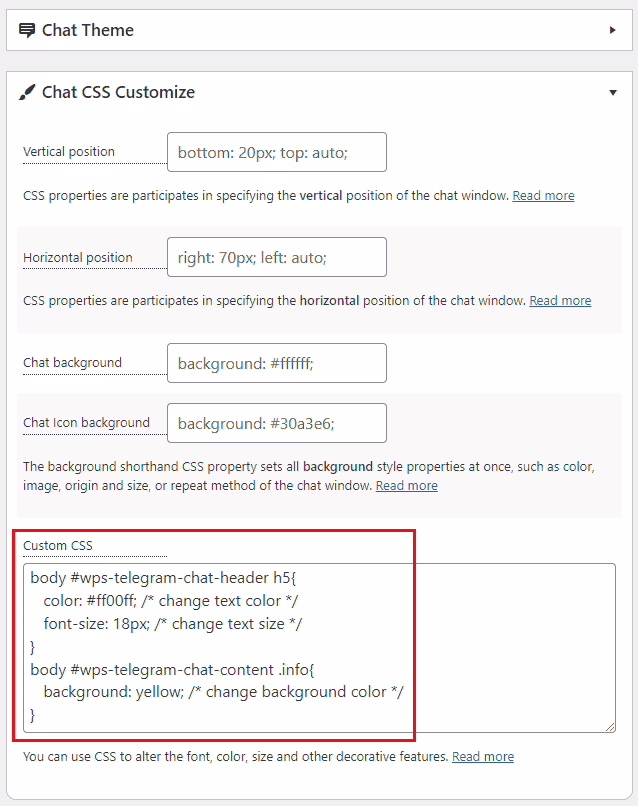You should know a little CSS or study it Read more… For example, we want to change the color and size of the chat title (point 3 in pic above). This applies to the selector from point 3 of list, copy it and make a CSS declaration block, below is our example: