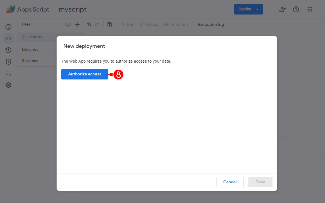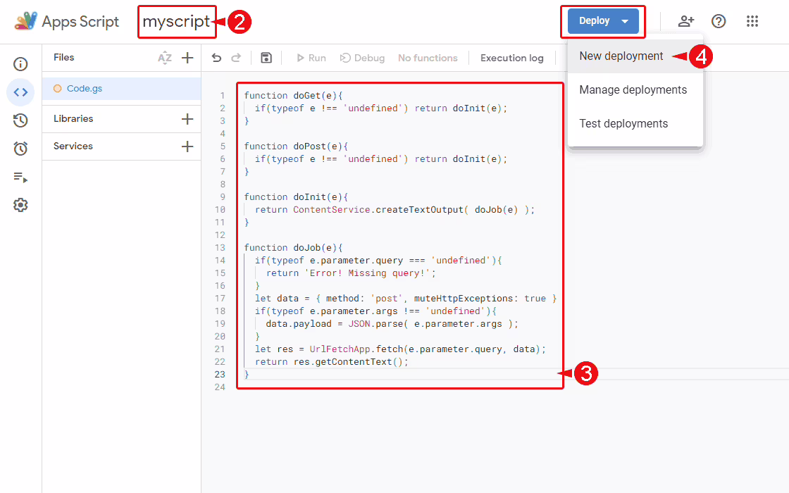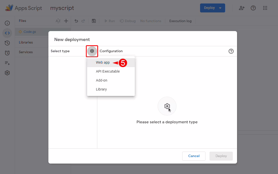 4) Click on Deploy at the top and select New deployment and it will open a popup