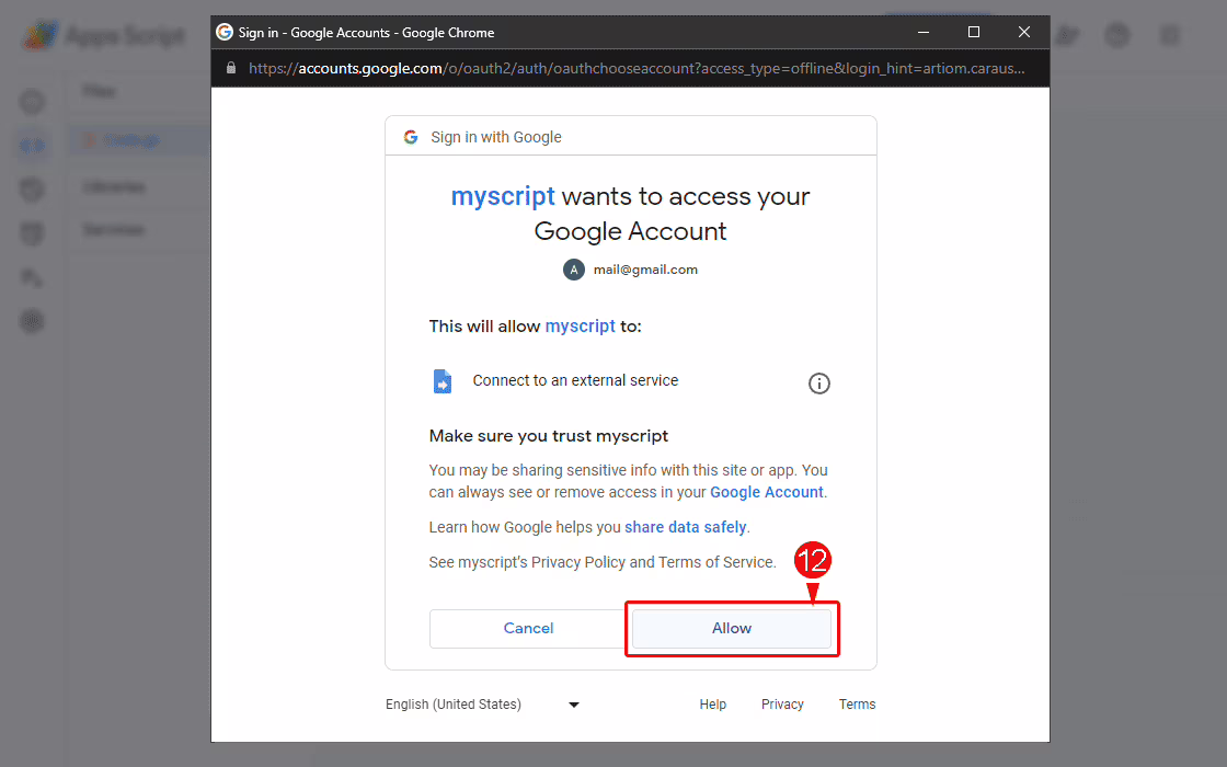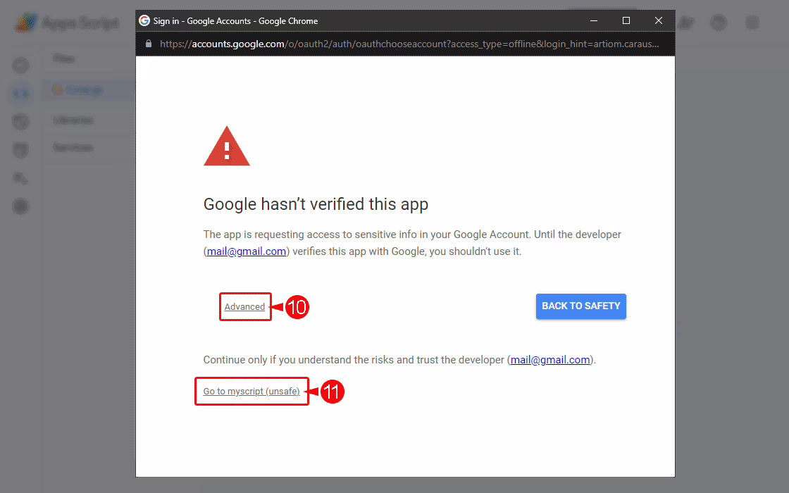 If you see a warning “Google hasn’t verified this app”, it is fine to click on Advanced