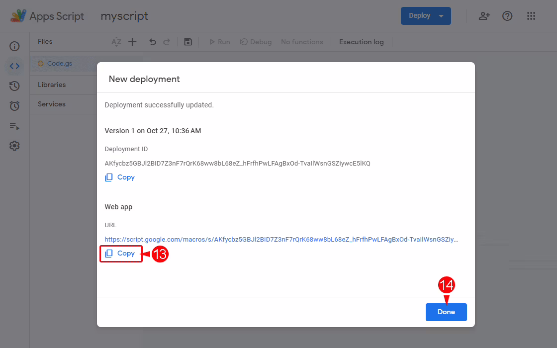 Copy the final URL click on Save and deploy, script has been updated and you are ready to use script for WPS Telegram Chat